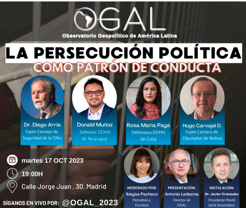 El Observatorio Geopolítico de América Latina que me honro en dirigir, tiene programado para hoy martes, 17 de octubre, a las 7:pm, un foro basado en “La persecución política como patrón de conducta”. El acto tendrá lugar en la World Jurist Association en la Calle de Jorge Juan-30. 19H martes 17 octubre 2023 ¡Te esperamos!