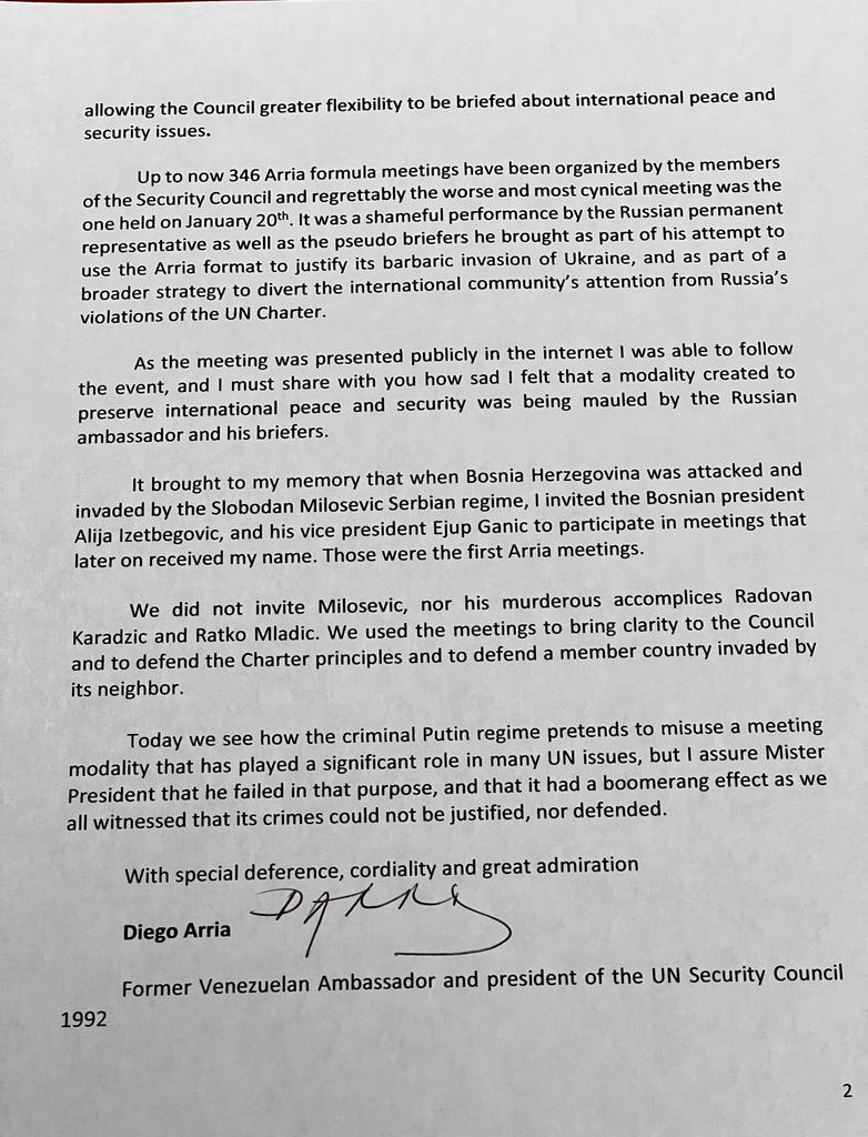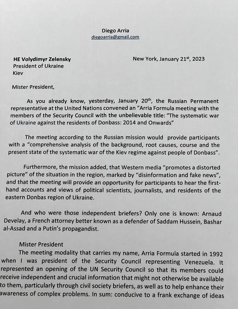 Letter to President Zelensky regarding the misuse of the Arria Fórmula at the UN Security Council. January 21, 2023