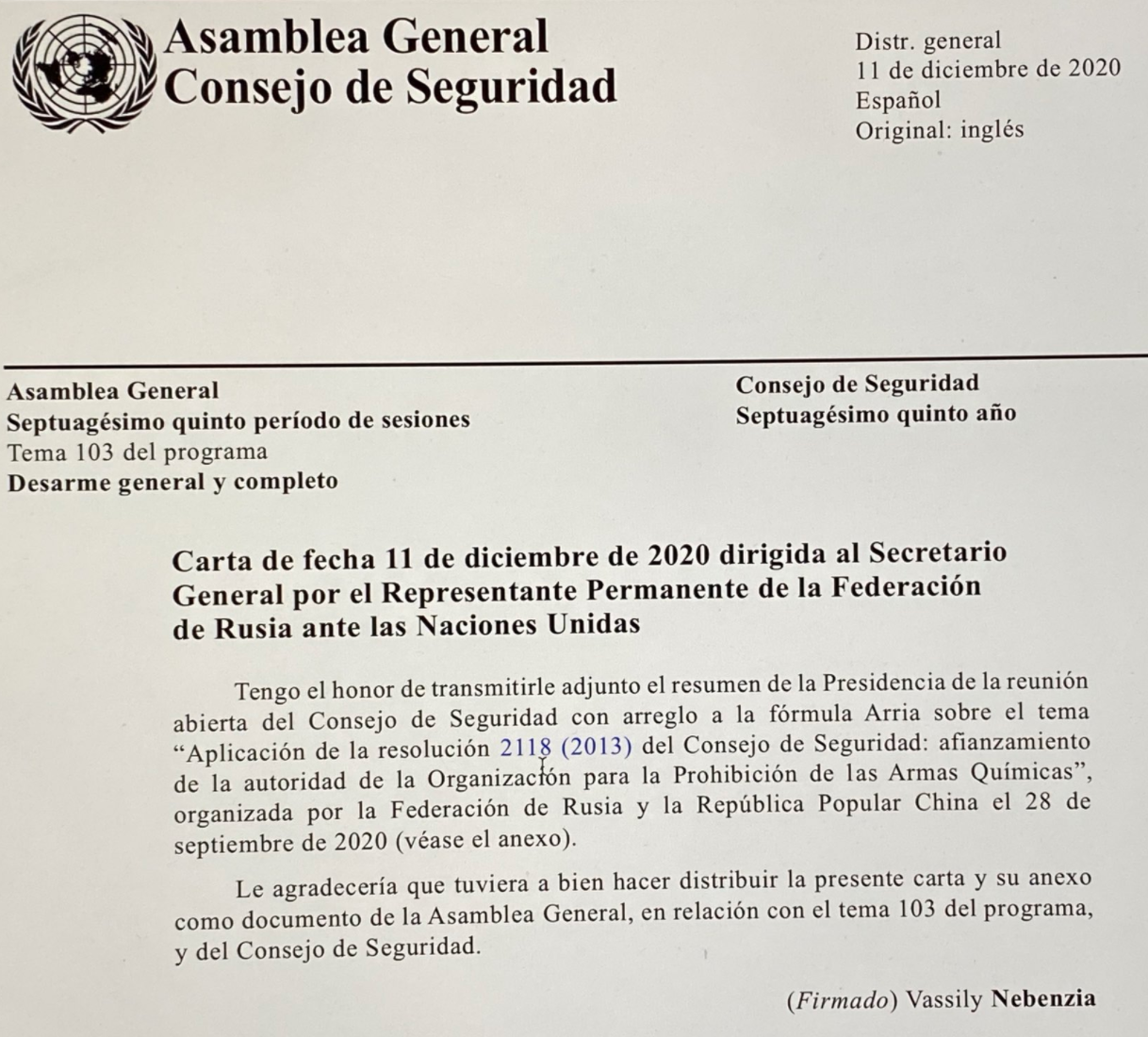 Enviado por admin el Mar, 19/01/2021 - 21:32 Rusia utiliza Fórmula Arria con miembros Consejo de Seguridad para discutir tema “Prohibición de Armas Químicas” Idioma Español