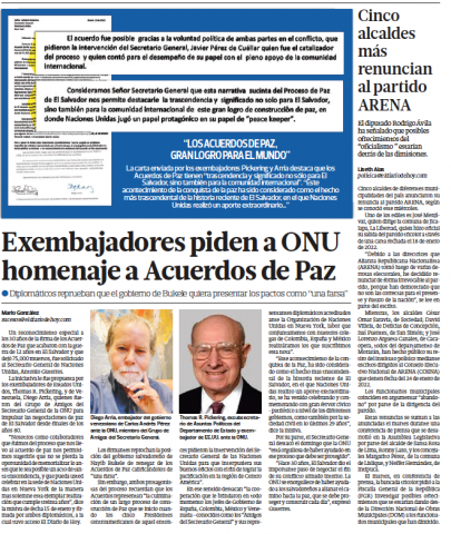Enviado por admin el Jue, 20/01/2022 - 18:30 Exembajadores piden a ONU homenaje a Acuerdos de Paz Exembajadores piden a ONU homenaje a Acuerdos de Paz Idioma Español